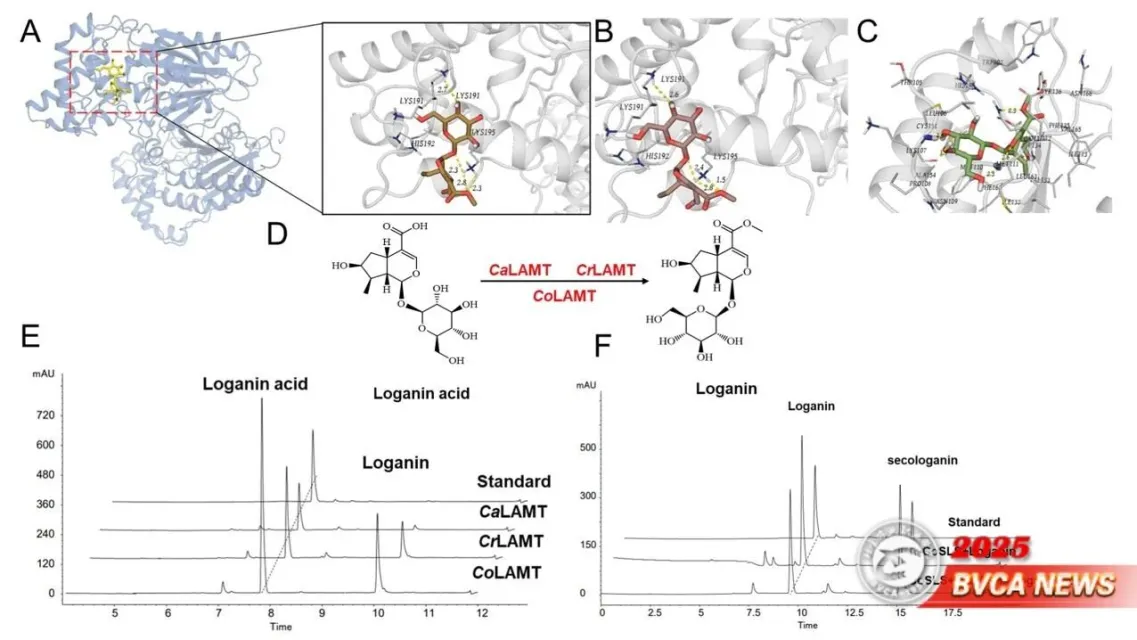 在此基础上,团队鉴定了山茱萸特有的马钱苷合成通路关键基因簇,包含了马钱子酸O-甲基转移酶(LAMT)和7-脱氧葡萄糖酸7-羟化酶(7-DLH)等关键合酶基因。分子动力学模拟与酶动力学分析表明,与近缘物种相比,山茱萸LAMT酶能够优先催化马钱苷酸的C-9位羟基化反应,显著增强了马钱苷酸向马钱苷的催化活性(图3)。特别是,团队将山茱萸LAMT基因及其上游调控因子导入本氏烟草,成功实现了马钱苷衍生物的从头生物合成(图3)。本研究揭示了山茱萸中完整的马钱苷生物合成通路,为马钱苷及其衍生物的药物开发与产业化应用提供了科学理论指导。