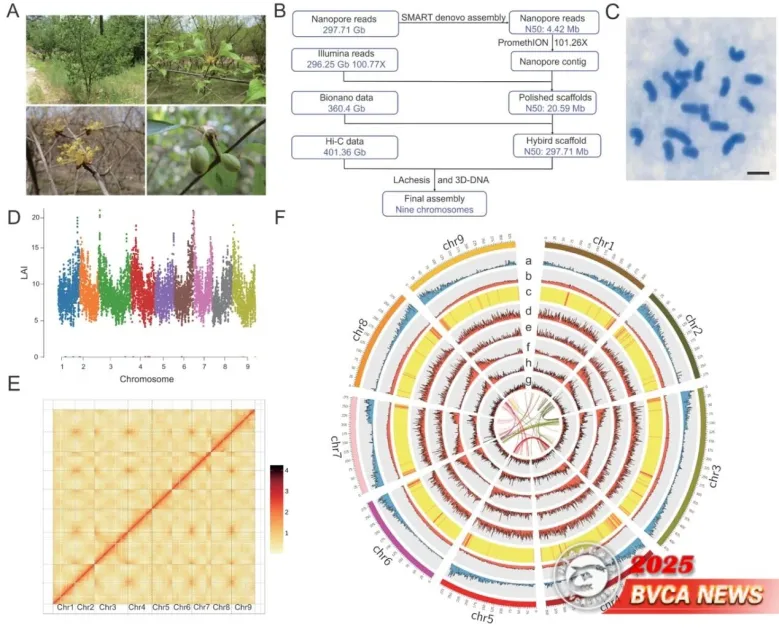 为破解这一难题,团队采用多方法整合策略,联合二代与三代测序技术,并结合Hi-C技术和BioNano光学图谱技术,成功组装了山茱萸染色体水平的高质量参考基因组(2n = 18),其基因组大小为2.96 Gb,N50长度达297.71 Mb,重复序列占比达75.04%,共注释到了41,911个蛋白编码基因(图1)。